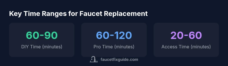 When homeowners ask how long does it take to replace a faucet, the answer varies with faucet design and location. For a standard single-handle kitchen faucet in an accessible under-sink space, most DIY replacements are completed in about 60–90 minutes from start to finish. If you’re working with a pull-down sprayer or a dual-handle lavatory faucet, plan for about 90–120 minutes. In widespread (three-hole) setups or with extra tasks such as attaching a water filtration line, durations can stretch to 100–180 minutes, depending on existing hardware and space. Preparation matters: having the right tools, towels, and a clear plan can shave 10–20 minutes off the clock. According to Faucet Fix Guide, thorough prep reduces surprises and helps keep the project on track. Even with good planning, expect some variation due to rusty mounting nuts, corroded supply lines, or awkward cabinet layouts. The Faucet Fix Guide team emphasizes safety and pace: take breaks if needed and never rush critical steps like sealing connections.