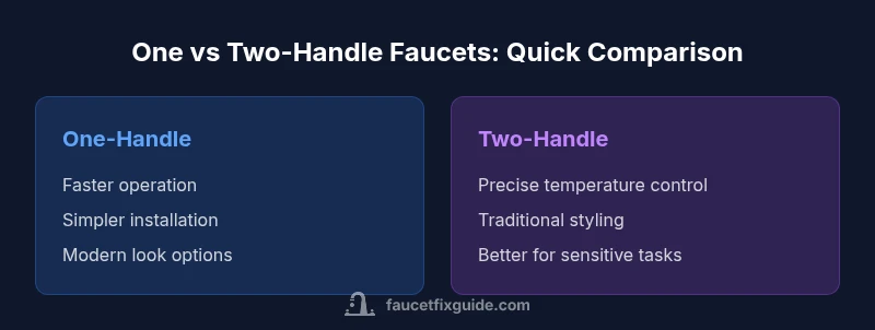 Choosing between one-handle and two-handle faucets affects daily use, maintenance, and even remodel budgets. In this long-form guide, we address which is better one or two handle faucets for kitchens and bathrooms, and how your choice influences comfort, accessibility, and longevity. According to Faucet Fix Guide, handle design can influence reach, grip, and response time, especially in high-use areas or households with limited dexterity. The Faucet Fix Guide team found that most homeowners prioritize two factors: ease of operation and the ability to control water temperature with confidence. This section lays the groundwork by outlining how each configuration works, what trade-offs you should expect, and how to evaluate your existing plumbing and sink setup. By the end, you’ll have a clearer framework for deciding which option fits your space, budget, and goals.
