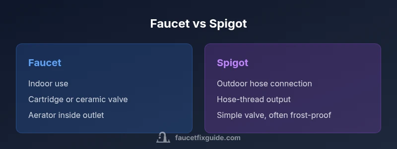 Practically, a faucet is an indoor water-distribution device that often includes an aerator and cartridge, while a spigot is an outdoor valve that controls water flow to a hose or outlet. The distinction affects parts, replacement options, and installation context.