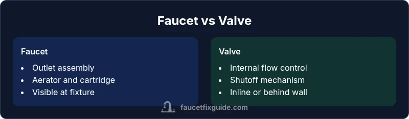 When you hear plumbers talk about the difference between faucet and valve, they are distinguishing two related but distinct components in a water-supply system. In most homes, the faucet is the visible, controllable end of the line that you interact with daily to get water for washing, cooking, or cleaning. The valve is the internal or upstream mechanism that actually starts or stops the flow of water. This distinction matters for diagnosing leaks, planning replacements, and budgeting for repairs. According to Faucet Fix Guide, clarifying which part is failing helps you avoid replacing the wrong component and speeds up the repair process. The distinction also affects what parts you might need, such as cartridges, seats, stems, or packing material.