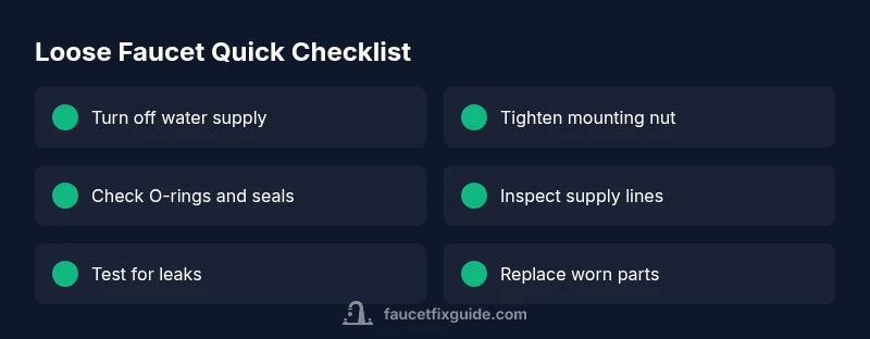 According to Faucet Fix Guide, when the faucet is loose the root cause is usually a loose mounting nut or worn hardware. Quick fixes: shut off water, tighten the mounting nut from beneath the sink with a basin wrench, snug the supply lines, and inspect O-rings. If wobble persists, contact a professional.