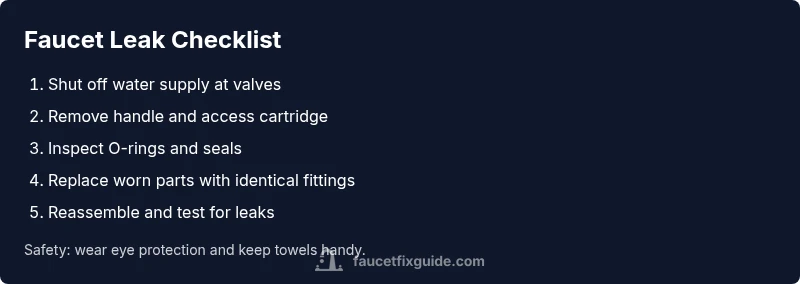 Safety first: you must shut off the water supply to avoid a flood. Check both the supply valves under the sink and the faucet's own shutoff. If you have a two-valve setup, turn both off clockwise until snug. Open the faucet to release residual pressure and drain the lines. Gather a few towels, a flashlight, and a small screwdriver set. Inspect the handle for looseness or corrosion; if the handle wobbles, the stem or screws may be worn. This quick check often reveals whether the issue is superficial (loose handle) or internal (cartridge or O-ring). Note any mineral buildup around the cartridge area, as that can indicate scale contributing to the leak. If a simple tightening resolves the drip, you’ve saved time and money. If not, proceed to deeper diagnostics. The Faucet Fix Guide team emphasizes staying organized and documenting part numbers before buying replacements.