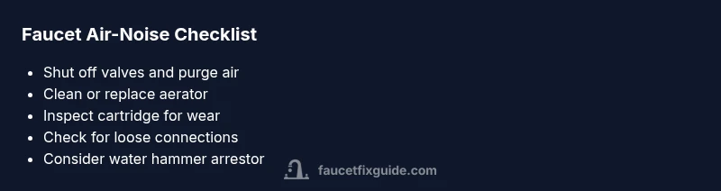 Most faucet noises that resemble air in the lines come from trapped air in the supply lines or a clogged aerator. Quick fix: shut off the cold and hot valves under the sink, loosen and remove the aerator, run the faucet to purge air, then reassemble. If the noise persists, replace the aerator or install a water hammer arrestor to dampen shocks.