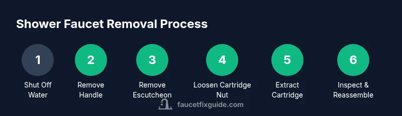 By the end you’ll safely remove a shower faucet and prepare for replacement or repair. Start by shutting off the water supply and relieving pressure, then gather basic tools. Next, follow a clear sequence: remove the handle, detach the escutcheon, loosen the cartridge nut, lift out the cartridge, and inspect for wear before reassembly. According to Faucet Fix Guide, a calm, methodical approach minimizes damage and makes reassembly easier.