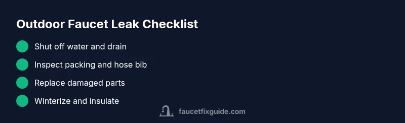 A leaking outdoor faucet is not just a nuisance; it wastes water and can cause damage to your home’s exterior wall and foundation. When you search for 'outside water faucet leaking', you’ll likely discover that most leaks originate at the control area around the handle or the hose bib spout. The first step is to understand where the water is coming from: is it dripping from the packing around the handle, seeping from the faucet stem, or spraying from the spout? In many homes, these leaks are the result of aging parts, temperature swings, or frost damage that undermines seals. According to Faucet Fix Guide, addressing leaks early saves water, prevents mold growth near doors and siding, and reduces long-term repair costs. This guide helps homeowners, renters, and DIY enthusiasts diagnose symptoms, choose safe fixes, and plan prevention measures to keep outdoor faucets trouble-free.