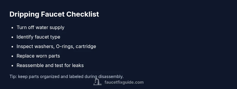 When faucet is dripping, it may seem like a minor annoyance, but even a slow drip wastes water and raises your utility bill over time. In residential fixtures, the drip typically comes from worn internal parts rather than a broken pipe. By understanding the basics—types of faucets (compression, ball, ceramic-disk) and where leaks originate—you can target the right part to replace. The Faucet Fix Guide team emphasizes that most drips stem from wear on seals and seats, which lets tiny amounts of water escape with every use. Tackling the leak quickly preserves water and prevents mineral buildup around the valve. In addition to reducing waste, addressing a drip helps improve indoor water pressure consistency and reduces the chance of more complex plumbing issues later. If you’re unsure about your faucet type, take a quick photo of the handle and stem before disassembly so you can compare parts later.