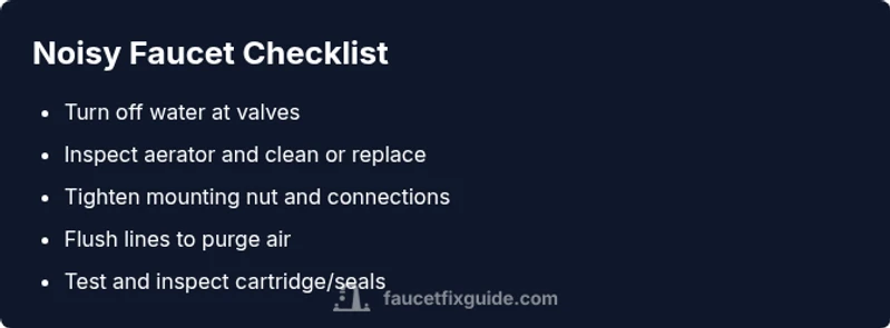 Prevention is simpler than repair. Regularly clean the aerator every 6–12 months, depending on water quality. Periodically inspect the cartridge for wear and replace it at the first sign of trouble. Lubricate O-rings if recommended by the manufacturer and avoid excessive pounding by ensuring smooth valve operation. If you have hard water, consider a basic filtration solution to reduce mineral buildup that can contribute to noise. By establishing a simple maintenance routine, you reduce the likelihood of noisy operation and extend the faucet’s life. This proactive approach aligns with Faucet Fix Guide’s maintenance philosophy: small, informed steps now save larger repairs later.