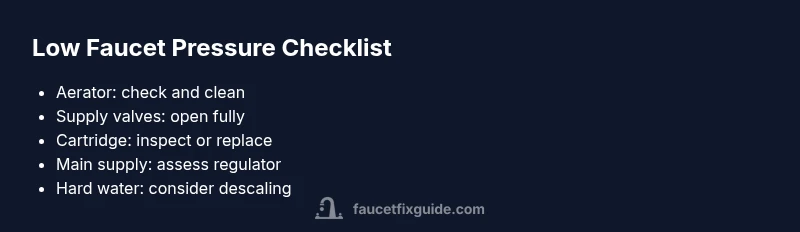If you’re asking why does my faucet have low water pressure, the answer is usually simpler than it seems. In most homes the problem isn't a broken pipe but a small blockage or a valve that isn't fully open. The two most common culprits are a clogged aerator and a shutoff valve that isn't completely opened. Hard water and mineral buildup can also restrict flow through the faucet internals. The Faucet Fix Guide team has found that these quick checks solve a large share of cases without calling a plumber. The first step is to test whether the issue is local to one faucet or affects multiple fixtures. If only one faucet is weak, the problem is almost always inside that faucet; if several fixtures are weak, you may be dealing with main supply pressure or a regulator. In either case, a methodical approach helps you avoid unnecessary repairs and keeps water flow strong.