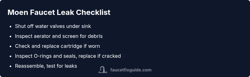 The moen kitchen faucet leaking is most often caused by a worn cartridge or loose connections. Start by turning off the water supply, then tighten the escutcheon nuts, clean the aerator, and inspect the cartridge. If the leak persists, replace the cartridge or O-rings. For stubborn leaks, consult a professional. This guide from Faucet Fix Guide outlines the exact steps.