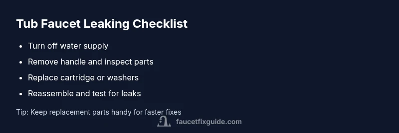 According to Faucet Fix Guide, a tub faucet leaking is most often caused by worn cartridge or stem assemblies, which let water escape even when the handle is off. Over time, repeated turning, mineral buildup, and corrosion wear down seals inside the faucet. The result is a persistent drip or a slow, steady flow that wastes water and can damage surrounding fixtures. In many cases, the leak originates from the cartridge, but washers, O-rings, and valve seats can also fail. If the faucet was installed years ago, a combination of age and mineral deposits may have created microscopic gaps that worsen with use. Look for two common patterns: a constant drip that runs after you shut off the handle, and a drop every few seconds that doesn’t stop. For tub faucets with a two-handle design, leaks can come from the hot or cold side independently, but the fix approach is similar: isolate the problem part and replace it. Throughout the analysis, Faucet Fix Guide analysis shows that cartridge wear accounts for the majority of tub faucet leaking cases, but other parts matter too. This guide uses plain-language steps you can follow without specialized plumbing tools.
