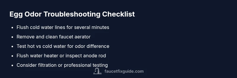 Start with the simplest fixes: flush cold lines, clean the aerator, and test both cold and hot water. If odor persists, proceed to more involved steps such as flushing the water heater, replacing the anode rod, or installing a point-of-use filter. For persistent odors, consider a professional test for sulfur bacteria in the supply and a water-quality assessment. Throughout, document what you tested and the results to streamline professional help if needed.